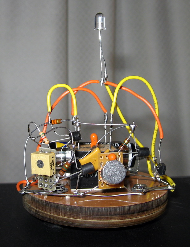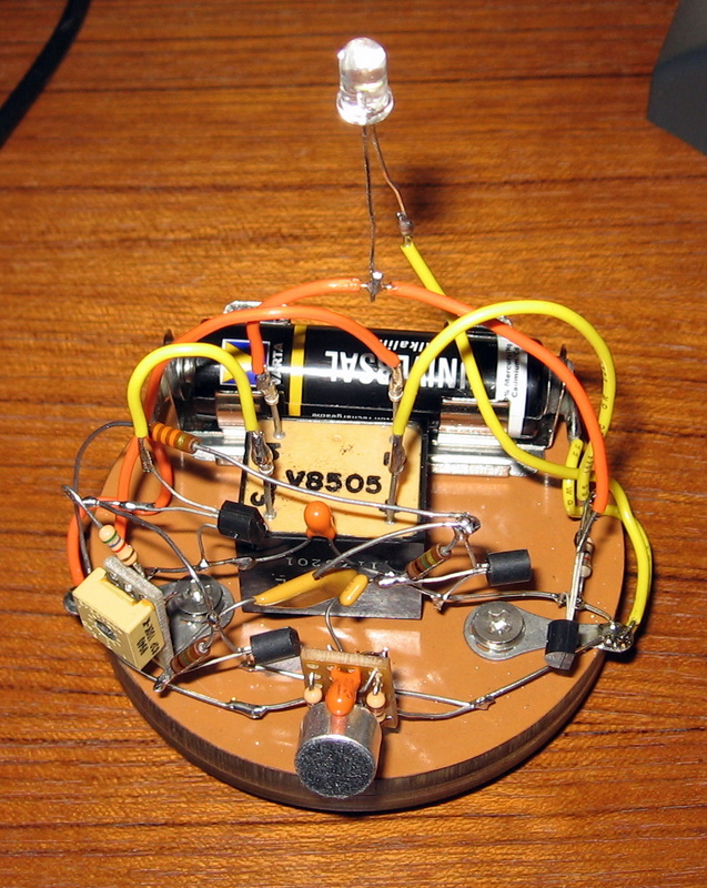 a mosfet Joule Thief circuit. Loud sounds flashes the white led.