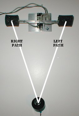 The microphones are each amplified with an opamp circuit to the gain of 100 and viewed on a dual trace scope. I used a small beeper for a sound source. Below is a photo of the setup and resulting waveform on an oscilloscope.