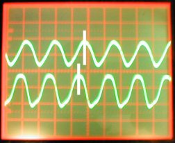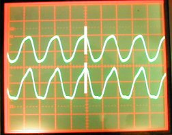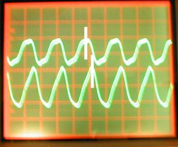 An oscilloscope trace plots voltage over time with the trace starting on the left. The "peaks and valleys" of the sound wave can be seen in real time.