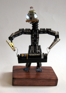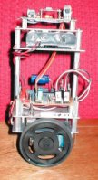 ROLLIE has only two wheels to roll on; each wheel is a pair of CD discs with a foam center. The foam center conforms to the surface and helps provide traction with the floor. The robot's battery pack is toward the bottom and lowers its center of balance. Rollie can move forward, backward, stop and turn upon its center.