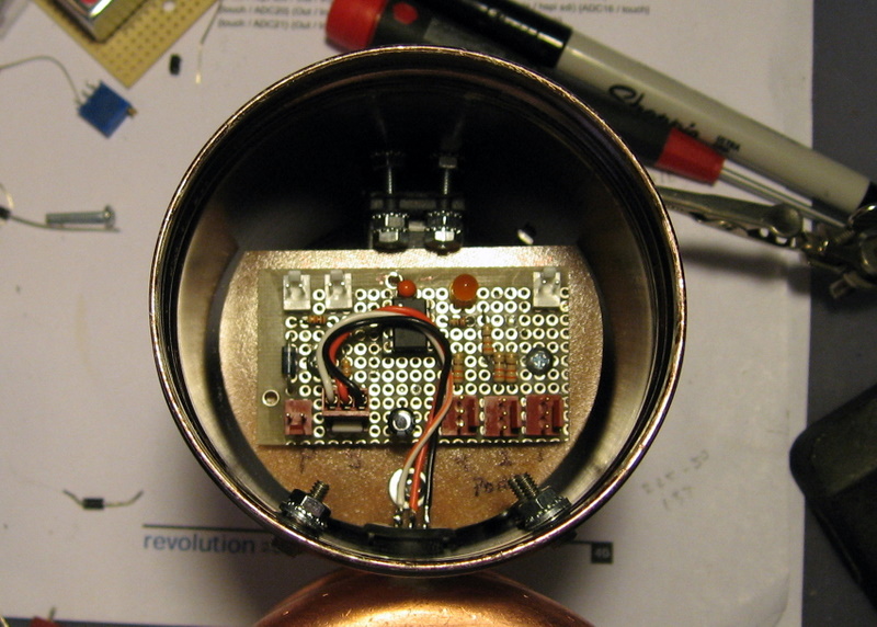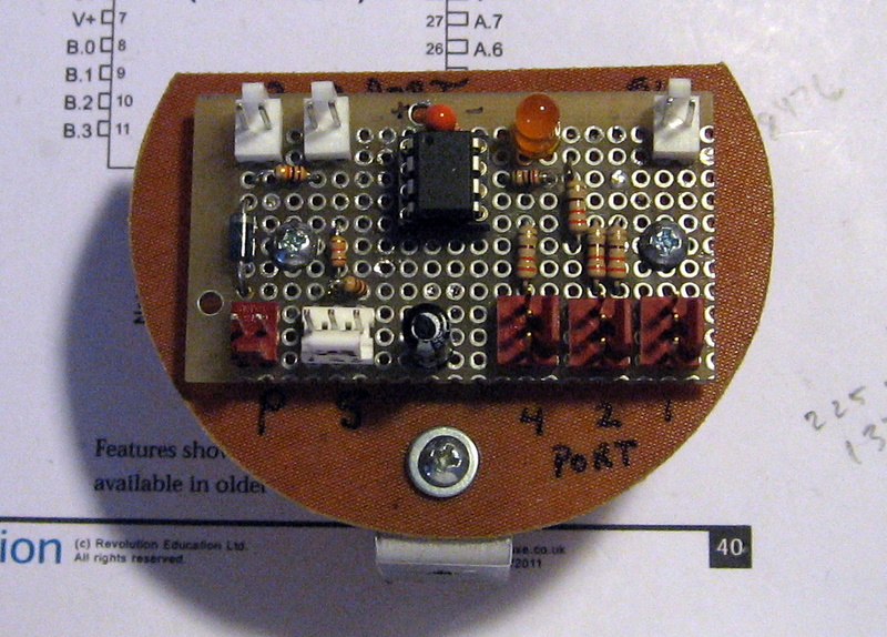 Hand-wired 08M2 Picaxe controller board.